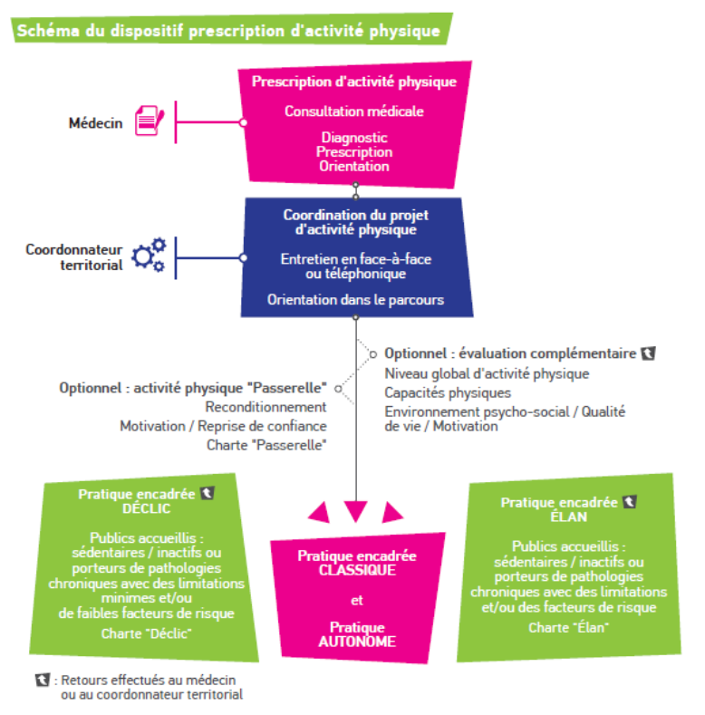 L'objectif du dispositif est de développer, sur un mode de fonctionnement multi-partenarial, la prescription d'activité physique pour les porteurs de pathologies chroniques et pour toute personne sédentaire, potentiellement à facteurs de risques.